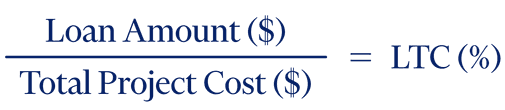 A ratio used in commercial real estate construction to compare the amount of the loan used to finance a project with the cost to build the project. If the project costs $1 million to complete and the $700,000 is borrowed, the loan-to-cost (LTC) ratio would be 70%. The costs included in the $1 million cost figure would be land, construction materials, construction labor, professional fees, and permits.